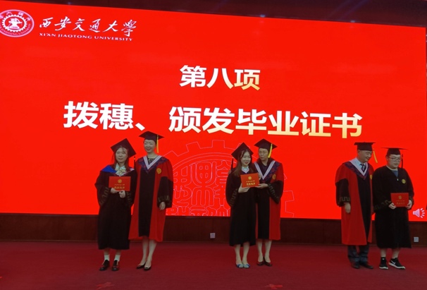 在学位授予仪式环节,全体毕业生踏着歌声身着学位服分批走上主席台,与等待在那里的老师握手,并接受拨穗。老师亲切地关怀着每一位同学,为他们送上最美的毕业祝福。