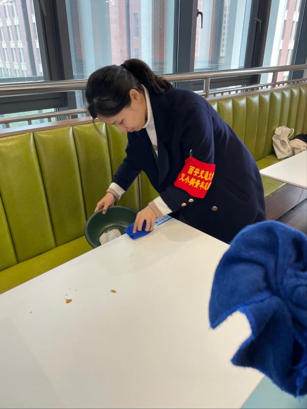 中午十二点,参加本次活动的同学下课后赶到餐厅,首先到惠园三楼餐厅的服务台与负责人沟通,领取志愿者袖章,之后就开始分工行动。本次活动主要包括三个部分。第一,在餐具回收处帮助阿姨收拾餐具,让同学们依次有序放置餐具。第二,领取抹布和盆,对餐桌进行清理,维持干净整洁的桌面环境。第三,提醒餐厅吃饭的同学珍惜粮食,争取做到“光盘”。