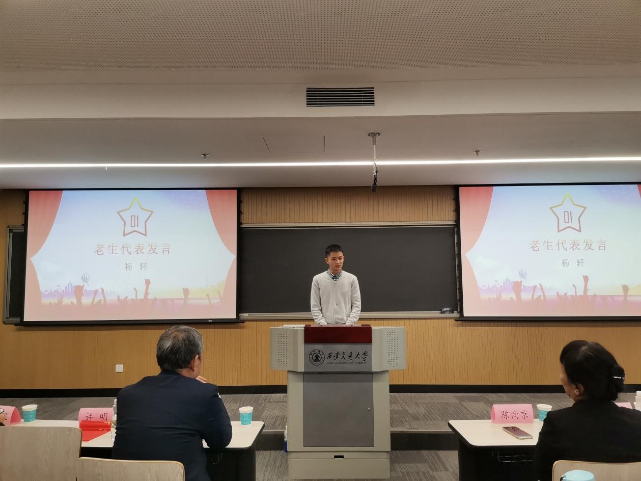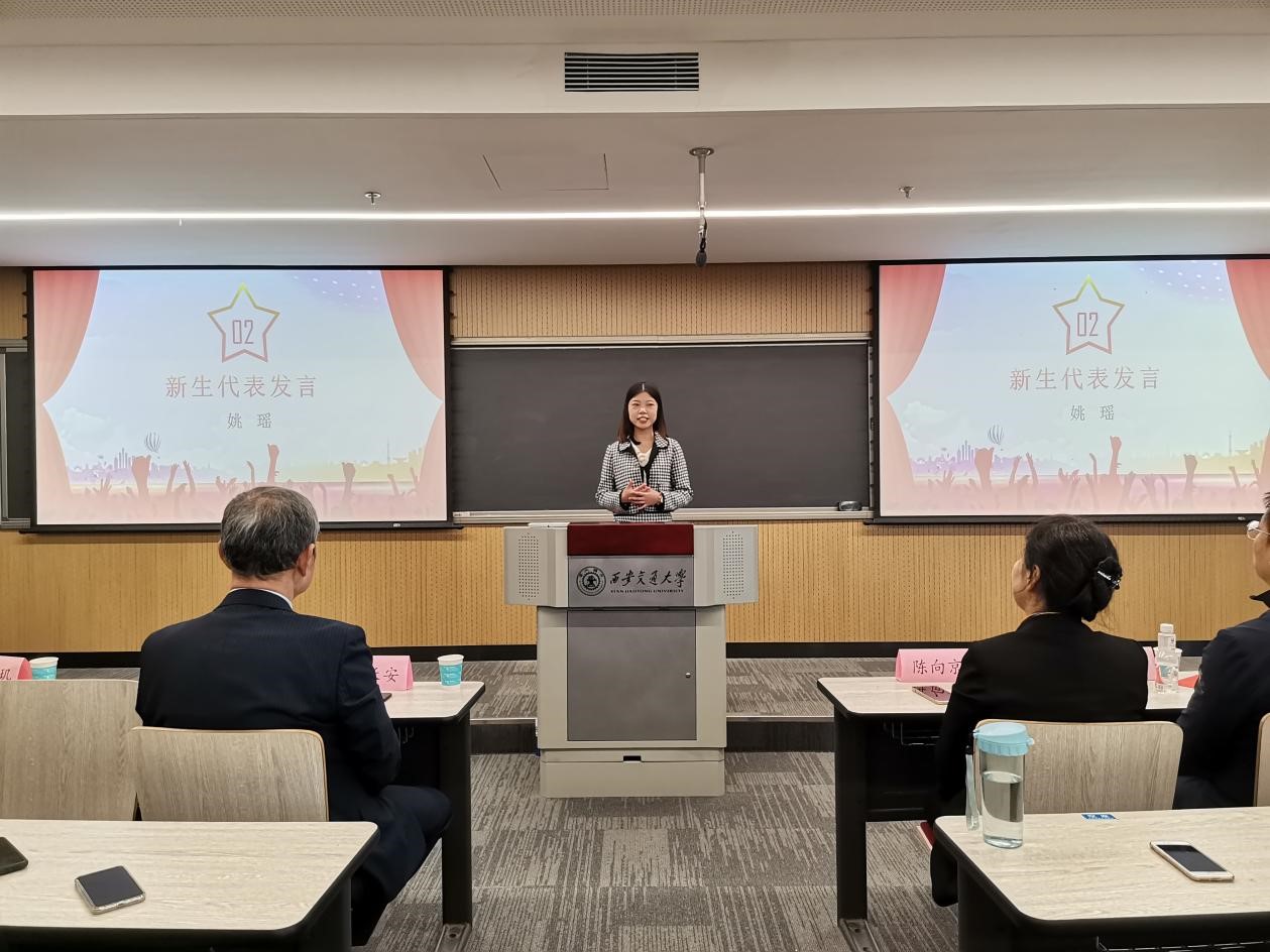 首先,老生代表杨轩同学和新生代表姚瑶同学进行发言。杨轩结合现实情况,希望同学们仍然要保持积极努力的心态,破除躺平想法,在新环境继续追求自己的人生目标。姚瑶用富有文采的语言向同学们分享了三点体会:要做德才兼备的求学人,要以求知若渴的精神研究学问,要心系祖国,培养家国情怀,成为具有爱国诚信之品行、突破创新之能力、社会责任之担当、国际前沿之视野的新时代外语人才。