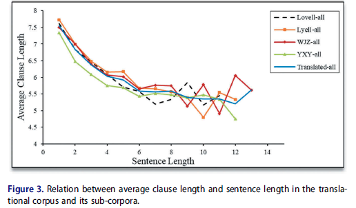 研究论文“Can dependency distance and direction be used to differentiate translational language from native language?”和“A syntactic dependency network approach to the study of translational language”发表在SSCI和A&HCI双索引期刊《语言》(Lingua)和《数字人文学刊》(Digital Scholarships in Humanities)上。这两项研究将依存句法分析和复杂网络计量方法引入翻译语言特征研究,发现翻译语言具有“折中”和“重心前移”的特点。论文“翻译汉语的活动度—基于在线语料库的研究”发表在外语类权威期刊《外语教学与研究》上。该文首次引入计量语言学的文体指标来研究翻译汉语的特征,深入揭示了英汉语言接触的规律。论文“Does Menzerath-Altmann Law Hold True for Translational Language: Evidence from Translated English Literary Texts”发表在SSCI和A&HCI双索引期刊《计量语言学学刊》(Journal of Quantitative Linguistics)上。该文尝试将门策拉-阿尔特曼定律(Menzerath-Altmann Law,简称MAL)应用于翻译语言研究,证实了该定律在翻译英语中的适用性,并借助定律公式的拟合参数区分了翻译和原创文本。论文获得2021年陕西省高校人文社科一等奖。以上论文的部分研究发现展示如下图: