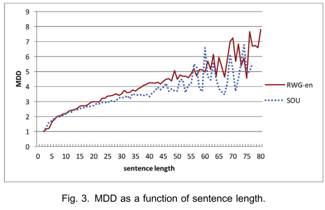 图1. 控制句长后,翻译文本(RWG-en)与可比原创文本(SOU)的平均依存距离(MDD)存在显著差异