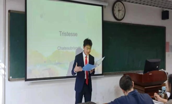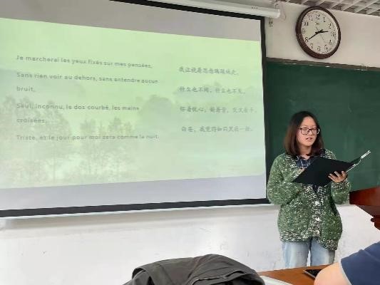 选手们都积极参与,精心备赛。自备比赛服装,制作精美的PPT文稿,选配背景音乐等,使比赛更加生动有趣。各位选手选材丰富,有法国诗人波德莱尔诗歌、小王子片段等。诗朗诵抑扬顿挫,选乐悠扬,契合诗歌意境。此外,老师们还在朗读后增加了法语问答环节,进一步考察了同学们的法语语音、语调及语言综合运用能力,增添了活动中的互动。