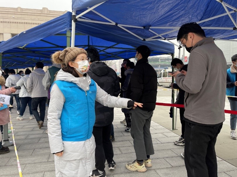 研究生志愿者,在严寒冬日里,维持涵英楼南广场秩序,并提醒同学们佩戴口罩,保持间距,从而引流进行核酸检测。由于创新港校区学生众多,给引导过程带来了一定的困难。更加考验耐心程度和整体协调能力,但最终,通过高频的提醒,诸如:请同学们提前准备好校园卡、请同学们前后散开,保持一定的安全距离等等,成功引导同学们有序进入检测大厅,高效进行核酸检测,为校医院的医护人员争取到了时间,为社会树立了交大学子有序配合核酸检测的良好形象,为塑造交大高效有序抗疫的面貌贡献力量。
