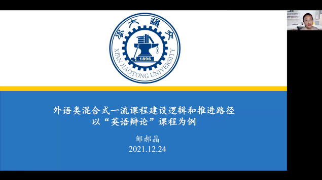 混合式教学专题云端分享会”,钱希副教授和邹郝晶副教授分别作题为“双系统融合发展的混合式创新教学实践—以通用学术英语为例”和“外语类混合式一流课程建设逻辑和推进路径—以英语辩论为例”的主题报告,全院40余位教师在线聆听讲座。