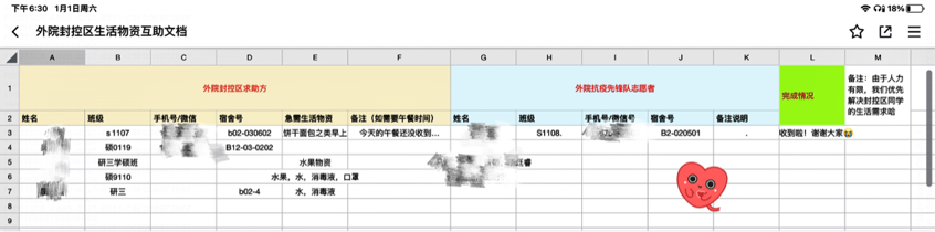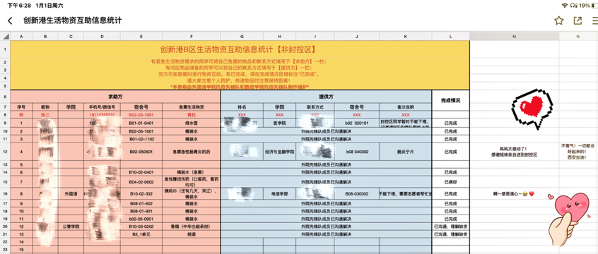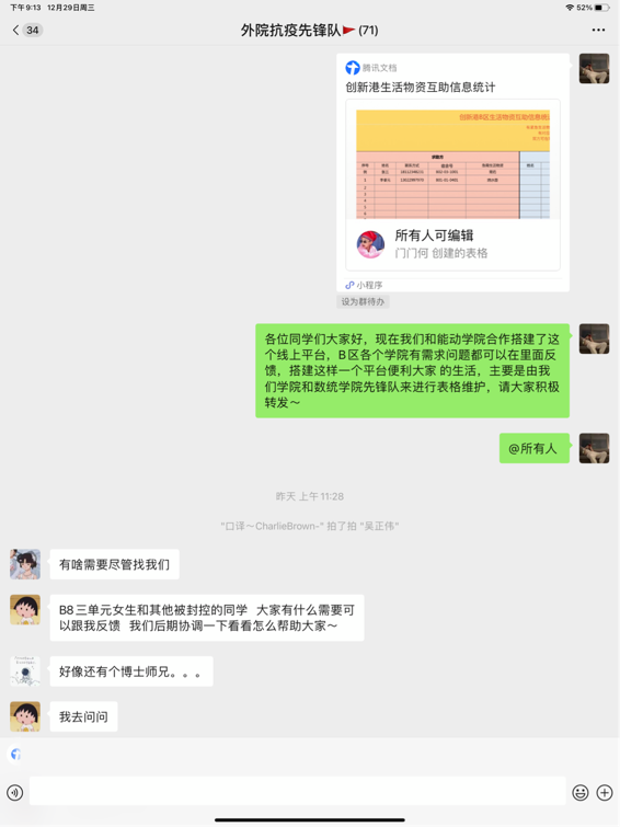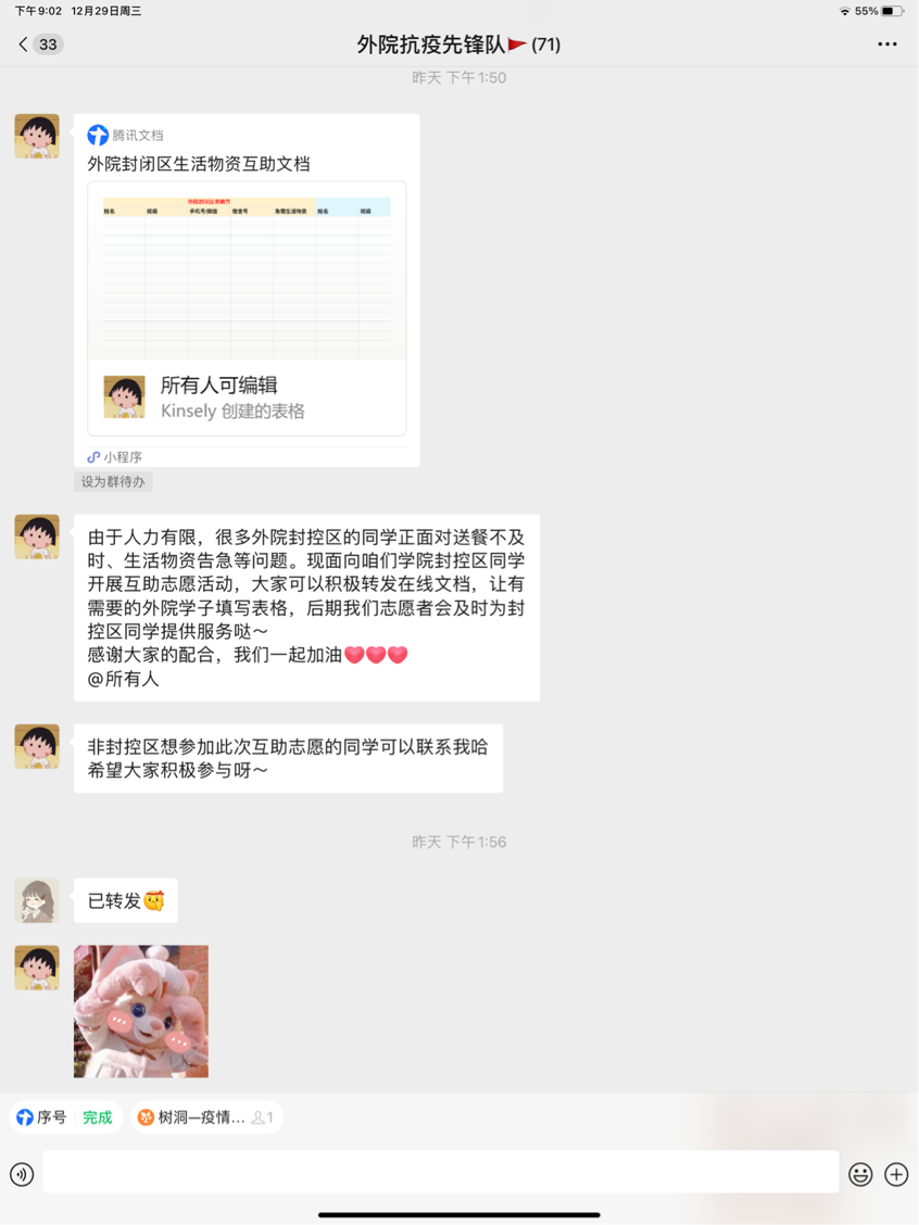 封控区同学所反映的送餐不及时,生活物资紧缺等问题,外院抗疫先锋队也创建了聚焦本院封控区学生的线上互助平台,即外院封闭区生活物资互助文档,旨在为同学们提供更多力所能及的帮助。