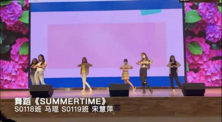 接下来,硕9110班的赵晓玲和成依静两位同学为我们带来了日语配音表演,为《失恋巧克力职人》的经典片段配音,两人配合默契,配音惟妙惟肖,引人入胜。而硕0118班石璐瑶、郭顺鑫、金柏岑和刘灵洁四位同学合唱的《我和我的祖国》感情真挚,在这个特殊的时刻带给了观众们无与伦比的自豪与感动。硕0118班解超杰和吕萌两位同学用一首诗朗诵《此刻,人间不需要话语》赞美疫情大考中的逆行者,是他们用行动诠释了爱与勇气的真谛。最后,硕0118班马琨和硕0119班宋慧萍等同学带来的欢快甜美的舞蹈《Summertime》为整场联欢会画上了圆满的句号。
