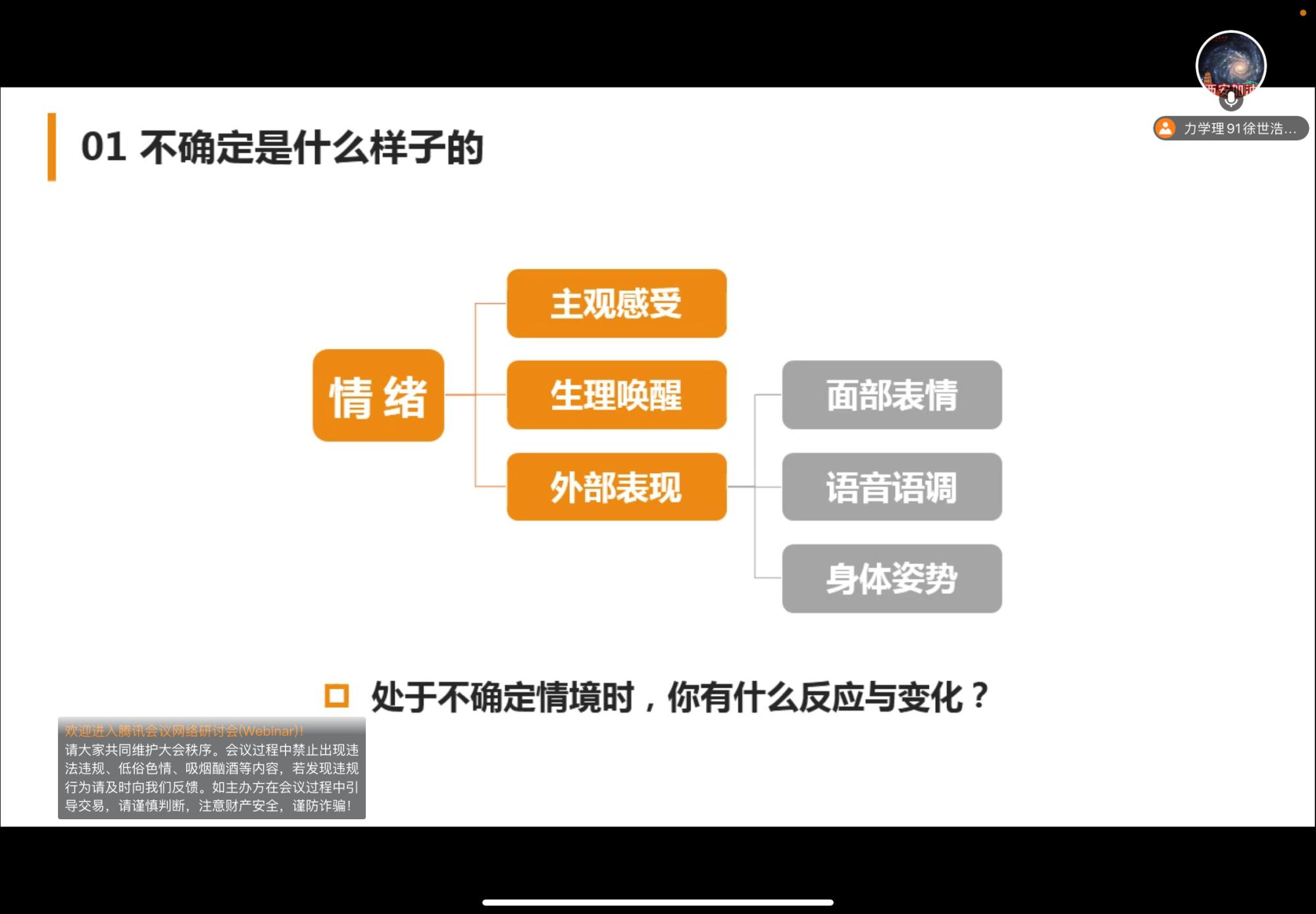 硕1107, 1108, 1109三个班级于5月25日联合开展“在不确定中发现自己的力量”线上心理知识讲座。