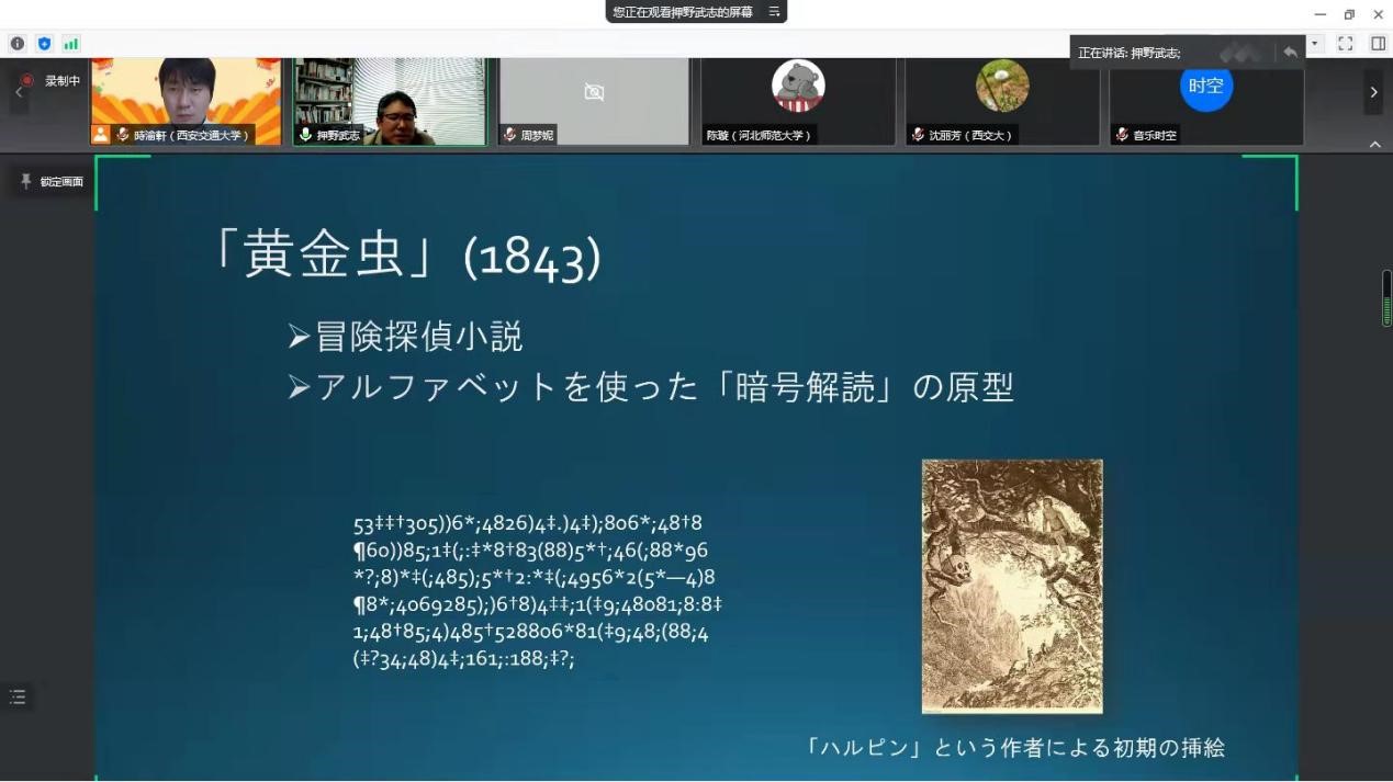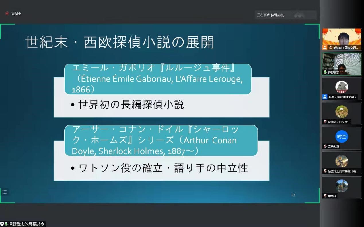 2022年4月27日15点至17点,外国语言文化论坛第209讲在线上顺利举办。本次论坛主题为“日本侦探小说的成立与发展”,特邀日本北海道大学文学研究院教授押野武志教授为主讲嘉宾。除本校师生外,本次论坛还吸引了北京大学、东北师范大学、郑州大学、同济大学、浙江大学、日本千叶大学等中日两国高校教师及学生共150余名参加。