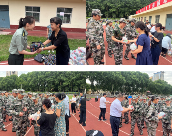 陈向京院长和张长安书记对军训教官和指导员表示慰问,随后学院领导老师逐一为每位学生发放慰问品。
