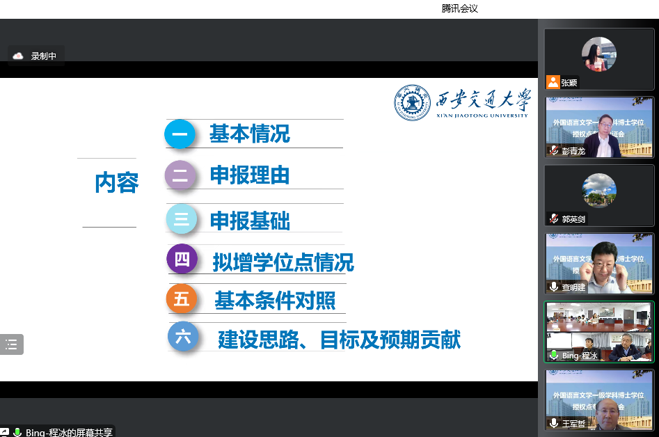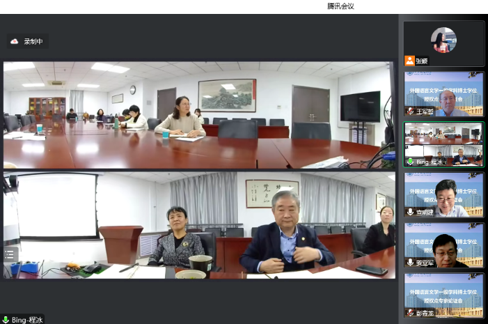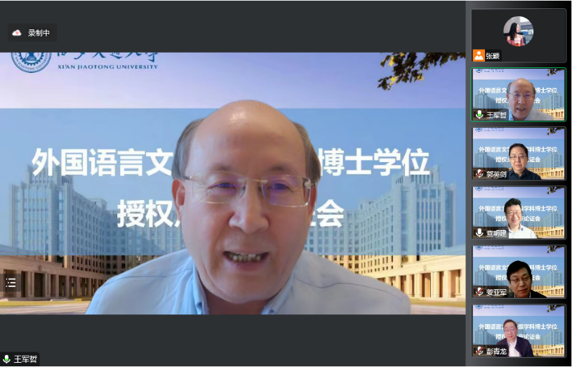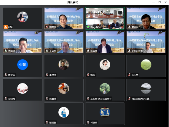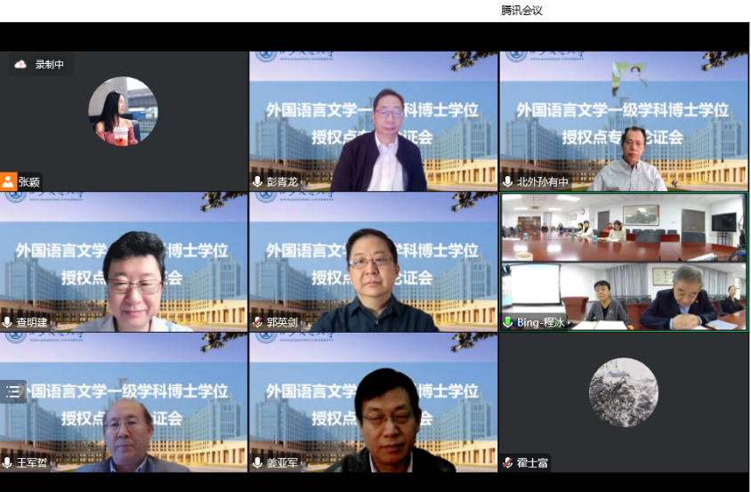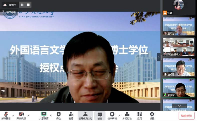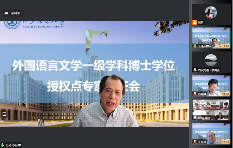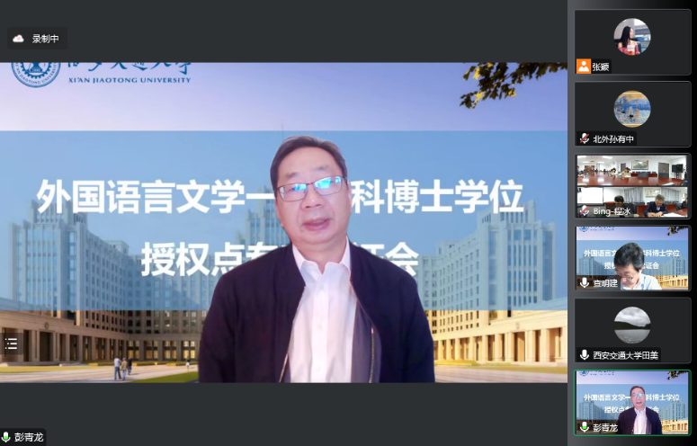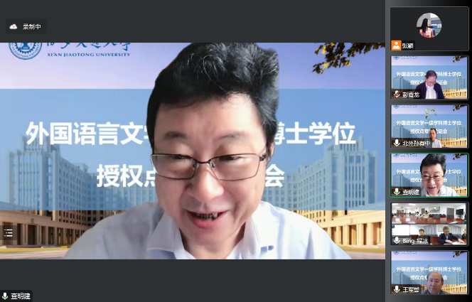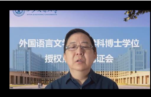 外国语言文学一级学科博士学位授权点专家论证会以线上线下结合的形式召开。出席论证会的专家有外国语言文学学科评议组召集人、上海外国语大学查明建教授,外国语言文学类专业教学指导委员会主任委员、北京外国语大学孙有中教授,外国语言文学学科评议组成员、上海交通大学彭青龙教授,外国语言文学学科评议组成员、中国人民大学郭英剑教授,外国语言文学类专业教学指导委员会委员、日语分委员会副主任委员、西安外国语大学王军哲教授,外国语言文学类专业教学指导委员会委员、英语分委员会副主任委员、西安外国语大学姜亚军教授和污污漫