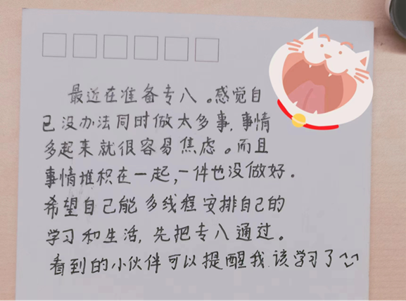 会后,支部成员互相交换心愿明信片,分享彼此的困扰。心理委员张春杰同志在心愿明信片中抒发了最近在时间管理上的困扰,例如很难维持专八复习与组织各项活动之间的平衡。团支部书记赵楠同志感同身受,两位同学互相倾诉,彼此鼓励,并积极探索解决问题的各种方法,焦虑的情绪得到了舒缓。还有同学写下了近期的小心愿,结成互助小组,帮助彼此完成心愿,支部成员间的友谊进一步加强。