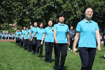 老师们迈着整齐划一的步伐入场,跟随音乐和口令的节奏,展现出昂扬向上的精神风貌。