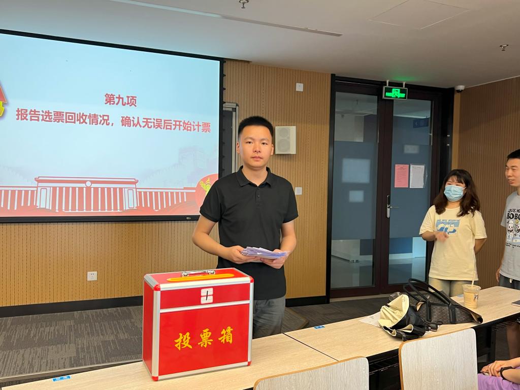 介绍完毕后,工作人员分发选票,主持人古新蕾宣读选票填写说明,监票员检验、密封票箱,代表填写选票。全部填写完毕后,与会代表在工作人员的引导下,按照指定的路线和票箱依次投票,监票人全程监督,清点票数。投票结束后,计票人杨倩萍、解超杰到计票室计票。