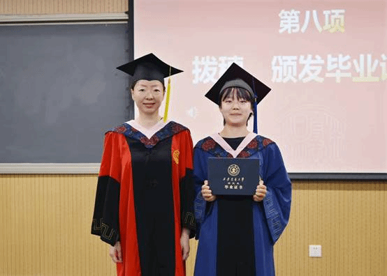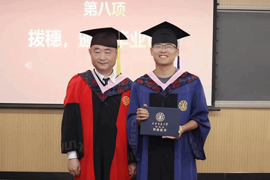 在学位授予仪式上,毕业生一一上台接受拨穗,领取毕业证书,并与老师合影留念,老师也为每位毕业生送上美好的毕业祝福。