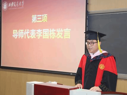 李国栋副教授作为导师代表发言,李老师首先祝贺同学们顺利完成学业,表示特色突出、具有影响力的交大MTI人才培养给毕业生带来了高社会认可度,毕业生在不同岗位发光发亮。随后,李老师为同学们提出几点建议:一是加强汉语学习,提高文字表达能力,二是关注国际关系,维护国家形象,三是处理好人际关系,四是有效释放压力。最后李老师祝愿毕业生工作顺利,事业有成。