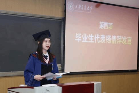 杨倩萍同学作为毕业生代表发言,首先对学院、老师致以崇高的敬意和衷心的感谢,她表示这三年与众不同的求学经历沉淀了知识与本领,也理解了不确定性是生活的主旋律,所有的成长化为未来披荆斩棘的勇气与底气。最后她祝愿学校、学院再创辉煌,祝愿毕业生同学前程似锦,万里可期。