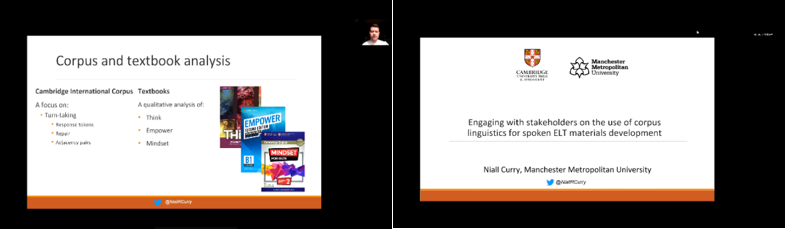 论坛延续专家访谈、专题讲座、听众问答相结合的方式。在专家访谈部分,McEnery教授和Curry博士就语言学习研究的不同视角与方法、语言学习资源的限制、语言研究的趋势与挑战等话题进行了深入交流。在讲座部分,Curry博士以“Engaging with stakeholders on the use of corpus linguistics for spoken ELT materials development”为题,介绍了他已经开展五年的研究项目。该项目针对外语学习者对提高口语的迫切要求与当前语言教材中有效口语材料的缺失之间的矛盾,采用语料库方法对非正式口语对话的核心特征(尤其是小词及话轮)进行分析,对英语教材中的口语素材进行调查,并通过工作坊和焦点小组相结合的方法,与教师、教材编写人员和语言测试开发人员进行深层交流,由此获得对所关注研究问题的全面认识。在论坛的问答部分,Curry博士、McEnery教授及陈琦副教授对教材开发如何适应日常交际话语的多样性、词频的参考意义、学生语言能力发展、学生在语言测试中的表现等问题展开了热烈讨论。