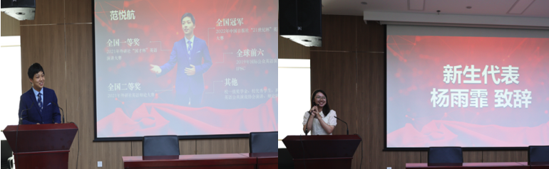 !”本科生代表范悦航在发言中首先欢迎了新同学们的到来;接着,他从“掌握可迁移的技能”与“把握独特视角,发掘共情能力”两个点出发,分享了他在外国语言文学专业的收获;最后,他用三个辩证法鼓励同学们拥有独处的能力,学会长远考虑,找到能赓续一生的学习的道路。