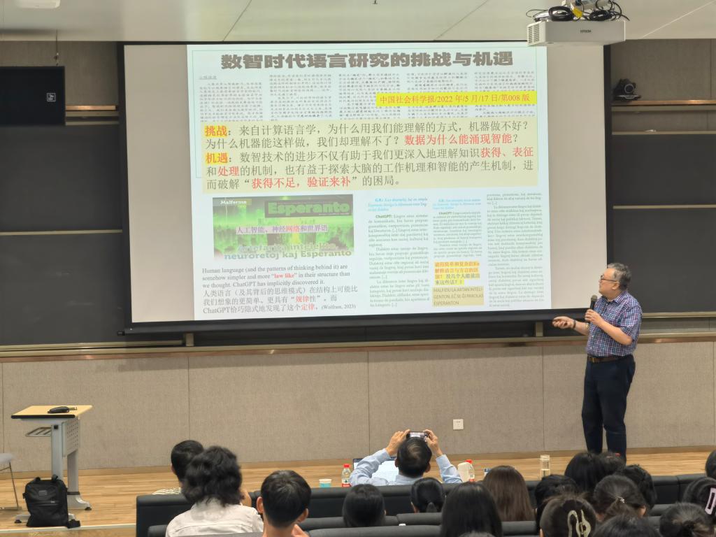 在学术科研方面给予的巨大帮助表示感谢。同时,院长鼓励同学们努力赶上数字智能发展的潮流,用跨学科的方法解决语言研究中的问题困境。讲座在师生们的热烈掌声中圆满结束。