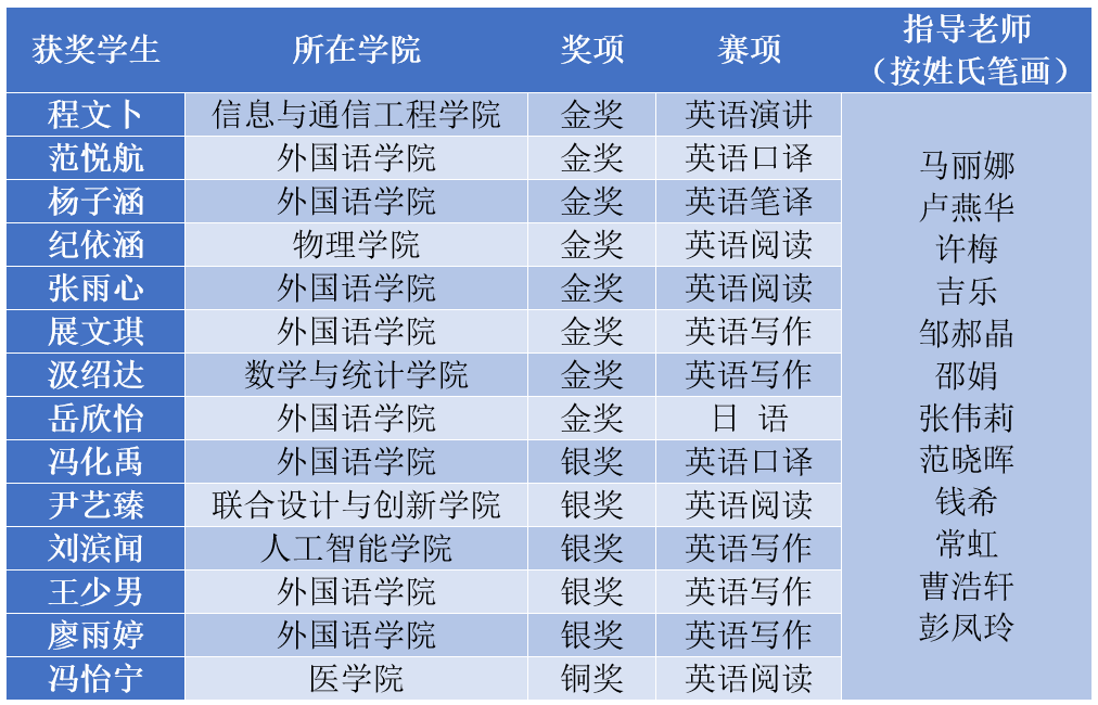 学子斩获金奖8项、银奖5项、铜奖1项。其中,在英语演讲和英语口译两项极具含金量的比赛中,来自信息与通信工程学院的程文卜和污污漫
