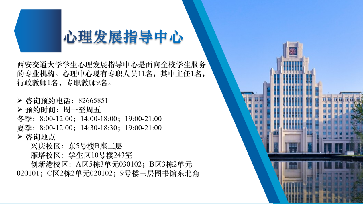 心理发展指导中心的相关信息,包括中心的地点、开放时间和预约方式,以及中心的设施和服务内容。