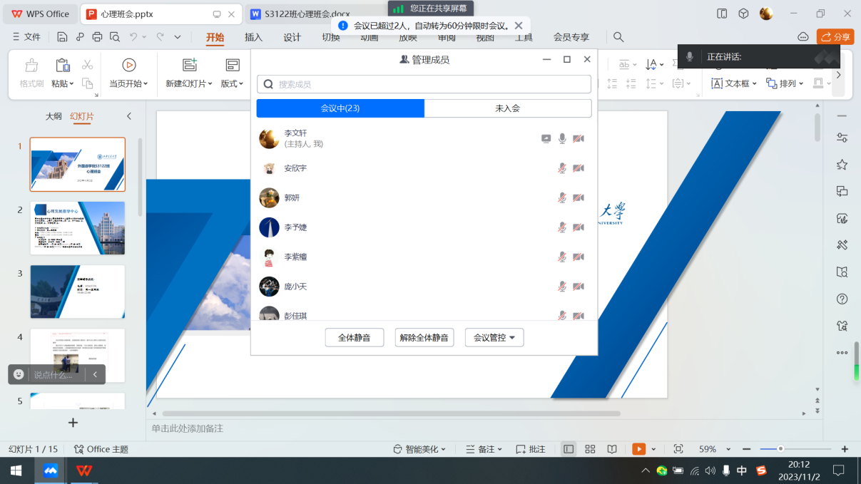 S3122班在腾讯会议举行了心理班会,应到25人,实到25人。会议由S3122班心理委员李文轩主持。