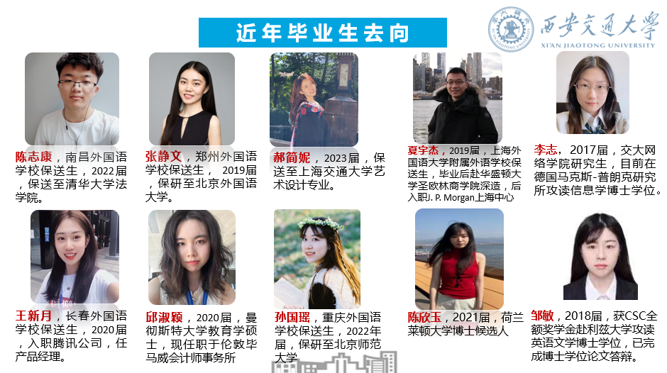 毕业生分布在各行各业,可从事翻译、教学、科研、国际贸易、外交、管理等行业。就业单位包括:1)各级政府部门任职(省市外办、招商局、安全局等);2)国内知名高校任教(如北大、上交、天外、西外等);3)金融、财会、经济、外贸、新闻传播领域任职(如国有大型银行、四大会计事务所、新华通讯社、中国日报社、中央电视台等);4)重点企业任职(华为、小米、比亚迪、阿里巴巴集团、腾讯、中国移动、中国核工业建设公司、陶氏化学、宝洁、戴尔、沃尔沃等)。