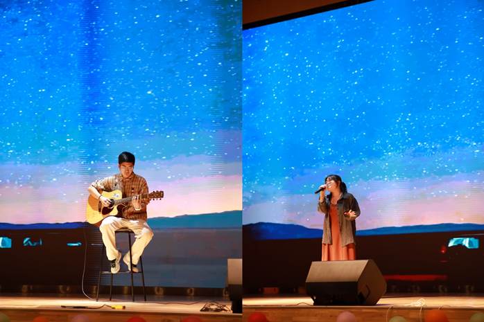第二章“经年”在女声独唱的《我的梦》中徐徐展开,在平静又执着的曲调中,庄可意唱出成长的美好——“记得成长的对话,勇敢地说我不再等待”。赵蕊鑫等四位同学表演了爵士《Shake It》,肆意涂抹青春的色彩。随后,由张一鸣弹奏、张微主唱的吉他弹唱《Innocence》则带来了青春的回忆,淡淡描绘着在千变万化的世界中,我们需要守护的初心。皮镝影等五位同学的爵士《Gods》坚韧有力,仿佛是一幅勇往直前、逆风翻盘的磅礴卷轴。而接下来,周芳菁和赵晗彤带来的是国风歌舞《浮光》,优美地演绎了浮光掠影里的历史与国色,拉上了第二章的帘幕。