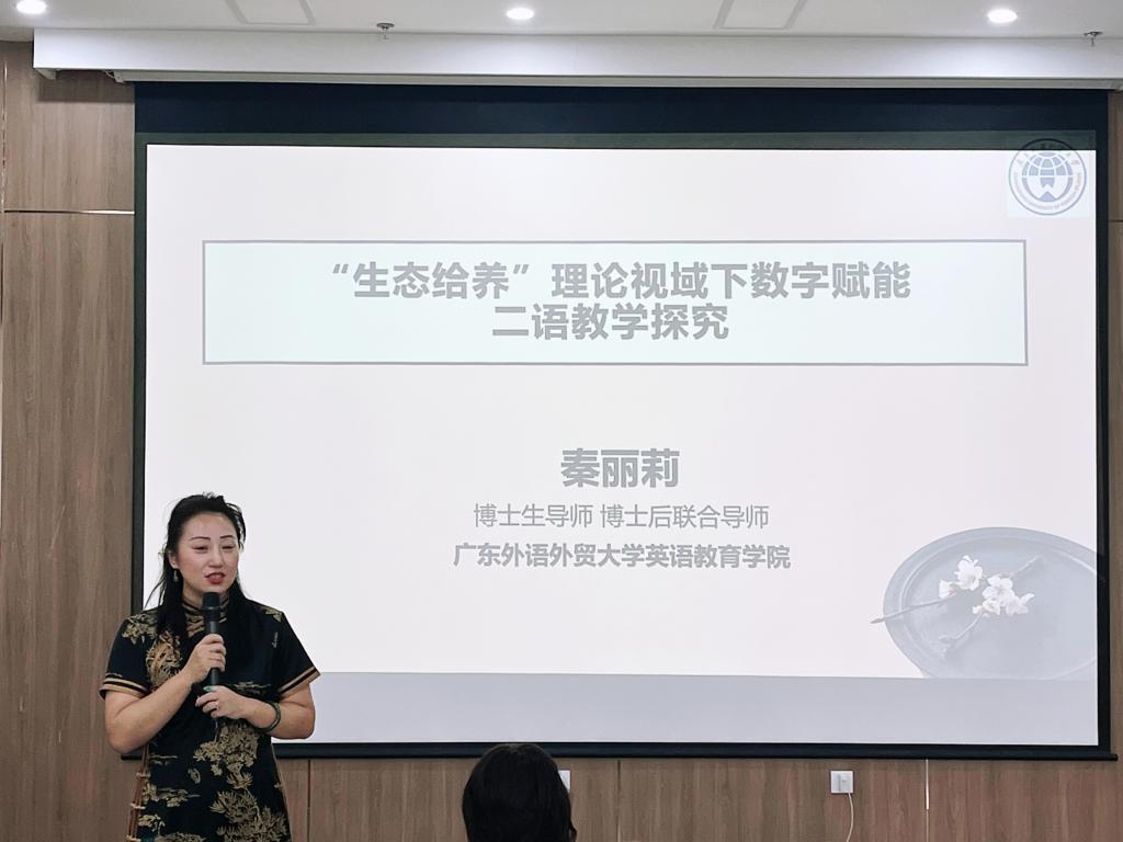 随后,广东外语外贸大学的秦丽莉教授作了题为《生态给养理论视域下的数字赋能二语教学研究探索》报告,详细讲解了生态给养理论在二语教学中的应用,探讨了如何通过该理论视角开展数字赋能二语教学质量评估,为相关研究提供了新的思路和方法。秦丽莉也从生态给养理论的学科属性和内涵出发,解释了该理论如何为二语教学提供独特的视角,并强调生态给养理论不仅关注教学内容和方法,还注重教学环境和教师与学生之间的互动。