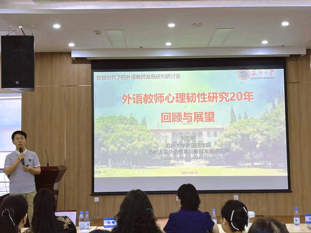 院长助理钱希教授主持下午的研讨会。苏州大学刘宏刚教授作了题为《外语教师心理韧性研究20年:回顾与展望》报告,刘宏刚回顾了近20年来教师心理韧性研究的发展历程,提出了未来研究的新方向,特别是在数字时代教师心理韧性发展的走向。刘宏刚还通过案例分析展示了如何在实际教学中应用这些方法,以帮助教师更好地应对数字赋能带来的压力和挑战。