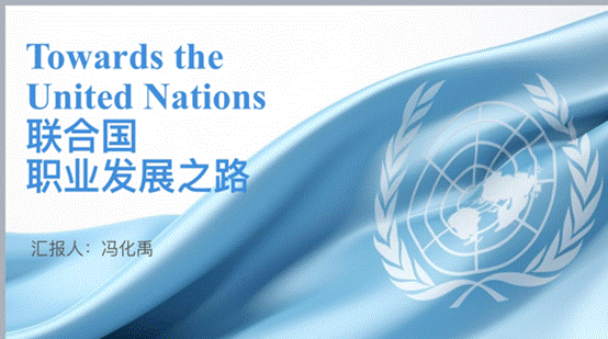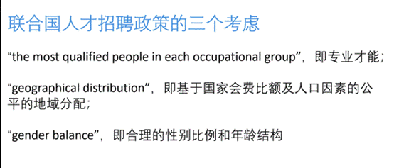 冯化禹同学还介绍了在联合国系统工作的好处,以及几种工作途径,包括但不限于YPP考试、JPO考试等。接着,他介绍了联合国人才招聘政策的三个考虑因素,包括专业才能、基于国家会费比额及人口因素的公平的地域分配,以及合理的性别比例和年龄结构。