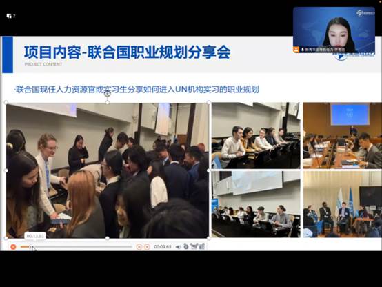 首先,王雨波老师引入往届实习生的经历分享,为大家介绍了该项目的基本情况、项目内容和实习收获,包括联合国维也纳总部参访、联合国国际组织外交参访、“绿色地球”模拟外交磋商、专题研讨、联合国职业规划分享会和城市调研等。同学们在丰富多样的培训与工作当中,提高了语言学习和专业融通的综合素养能力,更开拓了国际视野,代表中国为全球治理做出了贡献。