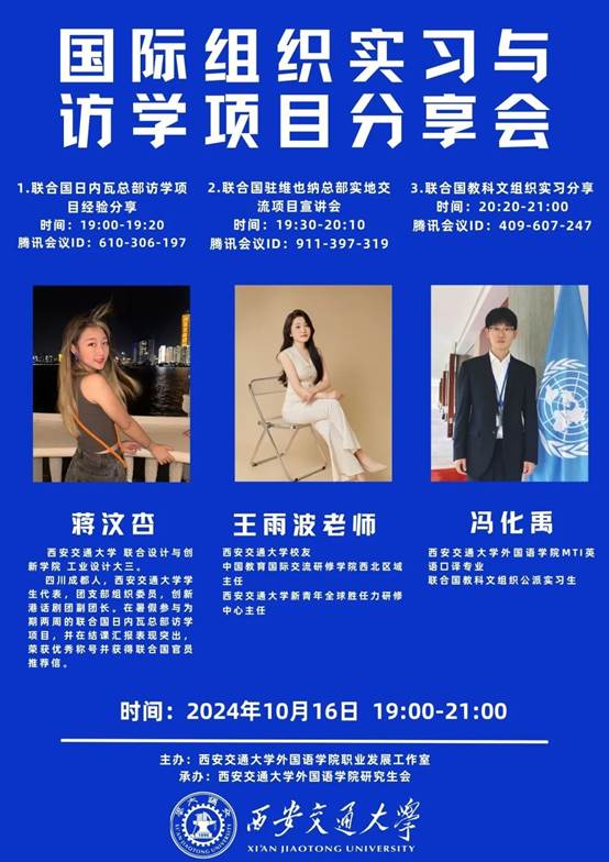 本次活动分为三场专题分享会,分别为联合国日内瓦总部访学项目经验分享会、联合国维也纳总部实地交流项目宣讲会、联合国教科文组织实习分享会。