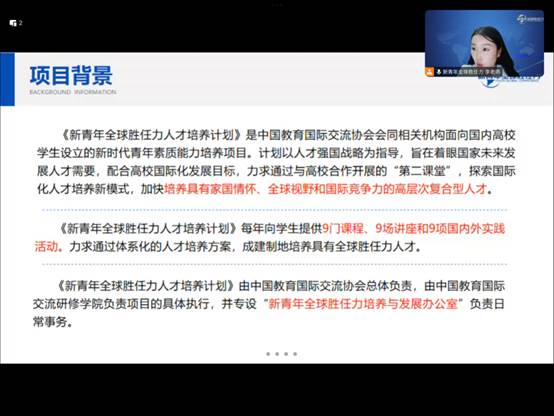 在第二部分,新青年全球胜任力研修中心主任王雨波老师对“联合国驻维也纳总部实地交流项目”进行了整体介绍,分享了往届实习生的经历和感悟,并讲解了项目背景、项目内容、项目特色及收获,以及报名方式等内容。