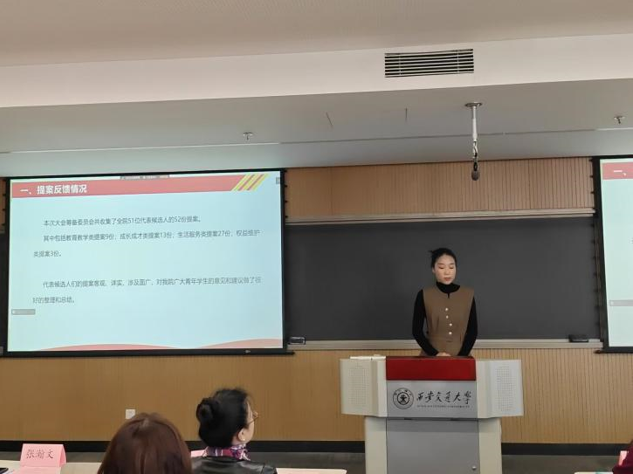 学生会代表刘沛含同学向大会做提案工作报告。刘沛含同学首先阐述了本次研代会提案提交情况,本次代表大会共收到来自全院51位代表候选人的52份提案,其中包括教育教学类提案9份、成长成才类提案13份、生活服务类提案27份、权益维护类提案3份。随后对其中的典型提案进行了简要介绍,如在污污漫