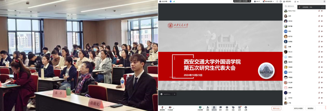 研究生分会的工作情况进行了总结。2023-2024学年,外院研会文体部顺利举办了金秋外语节、健康活动月系列体育赛事、四院联合毕业晚会等丰富多彩的文体活动;职业发展与对外联络部成功筹备了研代会,举办了职业生涯规划系列讲座,帮助同学了解行业发展知识;宣传部圆满完成各类宣传运营工作,如运营“XJTU污污漫