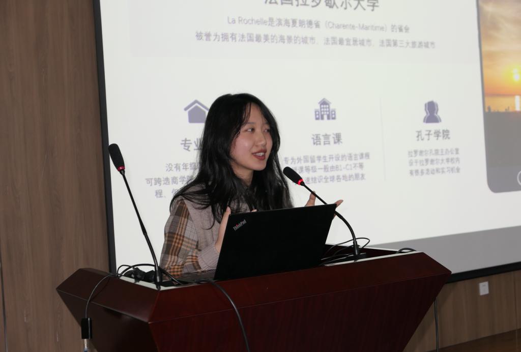 李秋石同学分享了她在法国交换期间,如何成为"多边形战士",平衡好学习与实习、竞赛的独特经验。她向同学们介绍了在孔子学院、奥运会及大使馆等机构的实习经历,并详细讲解了如何有效利用校内外资源申请国际组织实习的方法。此外,李秋石分享了参加节能减排竞赛的心得,强调外语专业学生可以与理工科专业同学开展合作,善用校内资源,在实践过程中提升跨学科学习能力与创新思维。