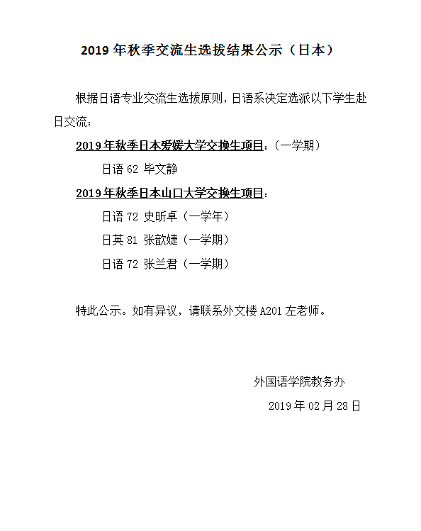 2019年秋季交流生选拔结果公示(日本)