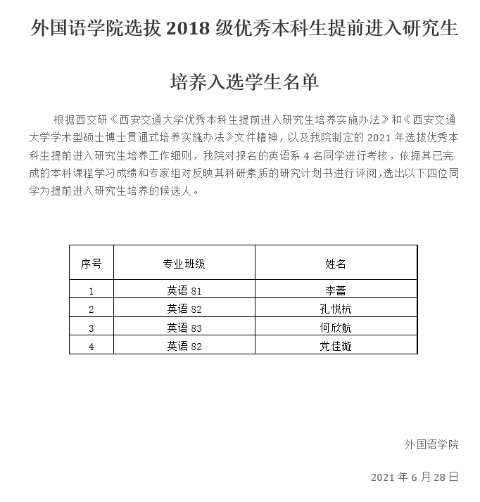 污污漫 选拔2018级优秀本科生提前进入研究生培养入学学生名单