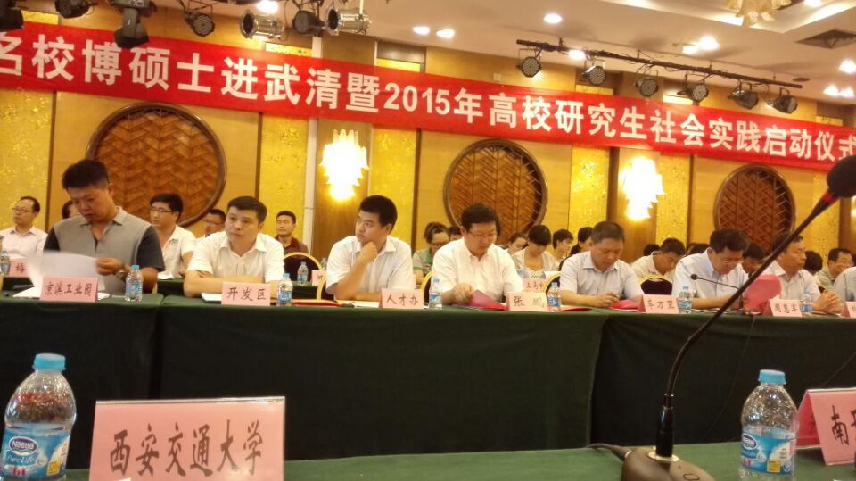 与清华大学、北京大学、北京航空航天大学、南开大学、天津大学、上海交通大学、浙江大学等八所“985”高校的师生参加天津武清区名校博硕士进武清暨2015年高校研究生社会实践启动仪式,天津武清区区委组织部、团区委、发改委、人社局及武清区各企事业单位领导出席,会议由武清区区委组织部常务副部长刘集贺主持。