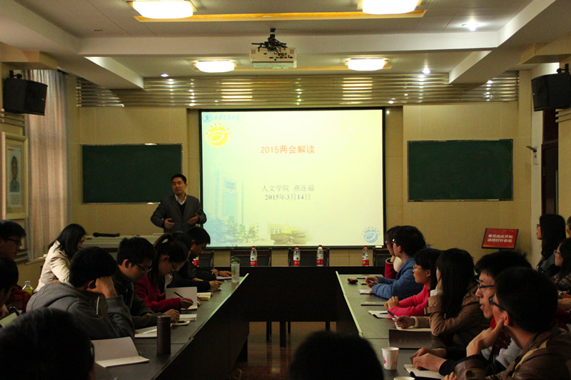 硕2014级党支部与机械学院硕4002班党支部在机械学院第三会议室举行“两会”研讨会。人文学院副院长燕连福教授应邀担任主讲嘉宾。机械学院党委副书记杨鹏老师,团工委书记、研究生辅导员王芬老师,污污漫