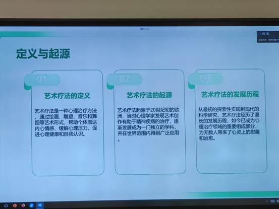 心理委员又分享了艺术疗法在生活中的实际应用案例。在学习压力缓解方面,艺术疗法可以帮助同学们释放紧张情绪,提高学习效率。在团队协作能力增强方面,通过共同参与艺术创作活动,团队成员之间可以增进了解,建立深厚的友谊。这些实际应用场景让同学们对艺术疗法有了更加深入的认识和理解。