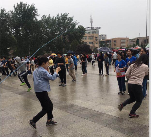 研究生集体分别参加跳大绳比赛和20×100米穿梭接力项目。研究生集体12人跳大绳团体计分赛在四大发明广场进行。天空下着小雨,但雨水丝毫没有影响他们的斗志。两个同学用力挥动手臂,抡起绳子,绳子 “嗡嗡”直响。带头的同学马上飞过绳圈,其余同学也一个个紧随其后。他们各个精神抖擞,身轻如燕。他们凭借团结协作的精神赢得了观众的欢呼与呐喊。