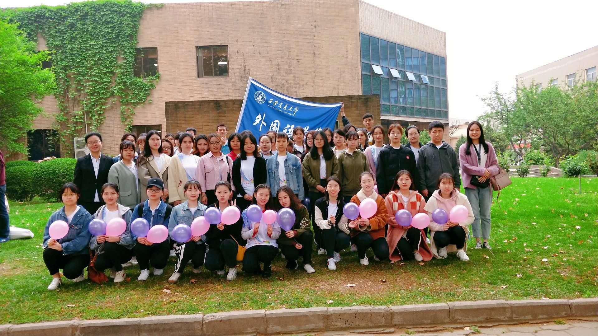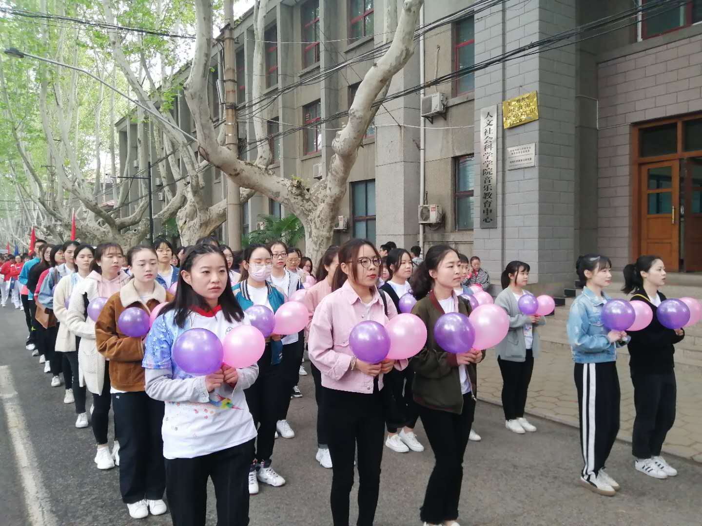 的方阵由党委书记杨小渭、党委副书记许明带队,五十三名外语学子及学院教师广播体操队紧随其后。他们脸上挂着灿烂的笑容,迈着整齐的步伐,她们在经过主席台时,一边喊着嘹亮的口号——“魅力外院,学贯中外,通联五洲,语跨四海”,一边挥舞着手中的气球,摆出“FL”的字样,这些都无不展示着污污漫