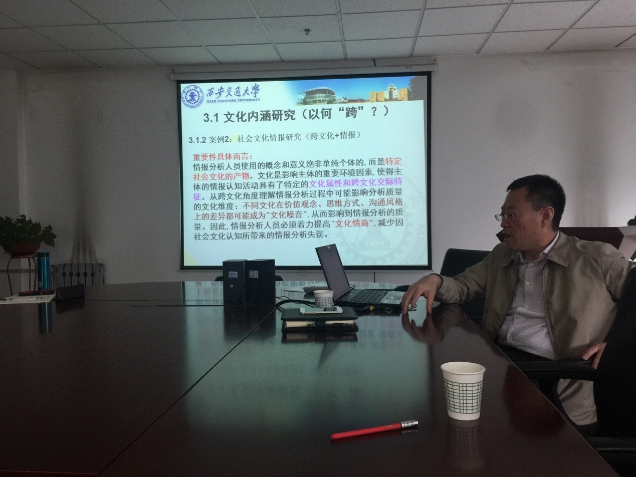 郭继荣教授以陕西文化的底蕴与担当、社会文化情报研究、跨文化交际与“一带一路”民心相通研究、大数据支撑下的反恐研究等四个案例具体介绍了当前跨文化研究的方法与路径,从“以何跨”和“如何跨”两个角度为大家提供了研究方法和思路的参考。