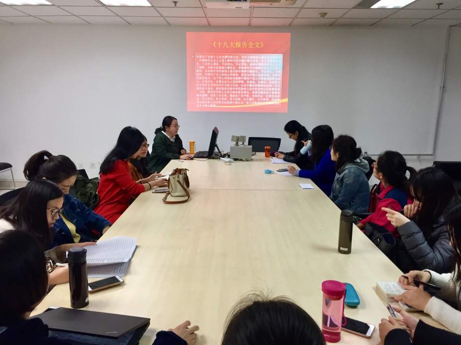 硕2015级党支部全体党员在外文楼B711会议室学习研讨十九大精神。会议由支部书记余碧燕主持。学院党委副书记许明老师参加了这次组织生活会。