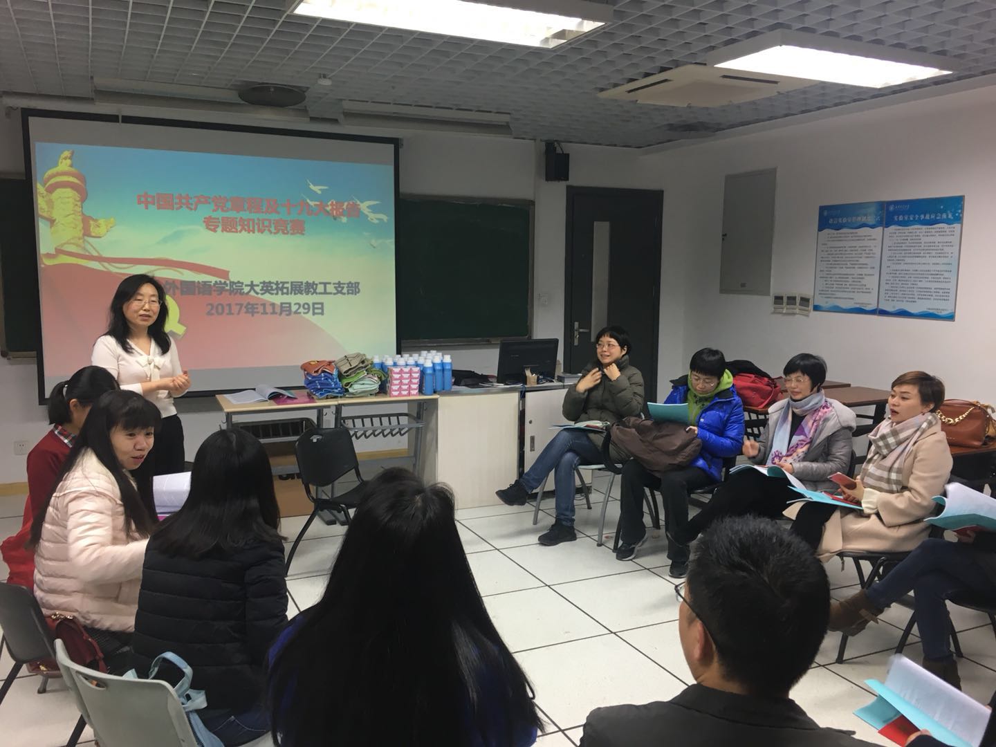 2017年11月29日下午,外文楼A 座501教室里欢声笑语,气氛融融。外语学院大学英语教学中心拓展教工支部正在举行一场别开生面的十九大报告和党章专题知识竞赛。知识竞赛由支部书记马琼老师主持,学院党委委员张长安老师作为联系人参加活动,并担任竞赛评委。