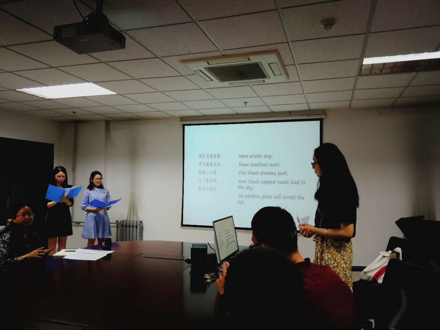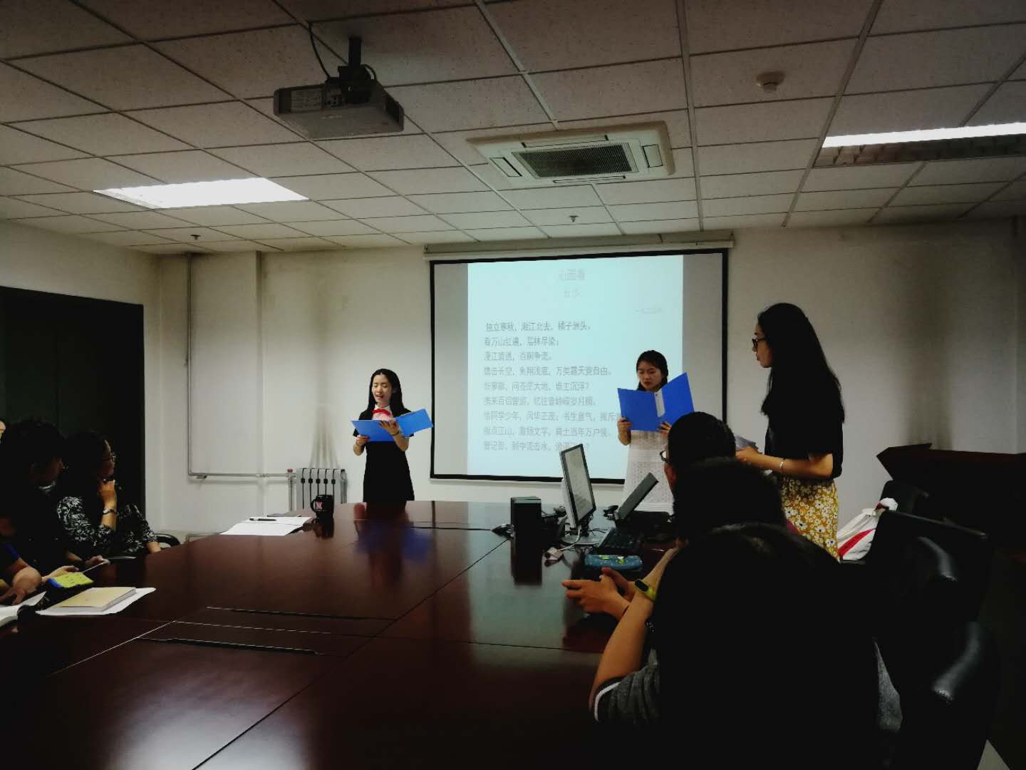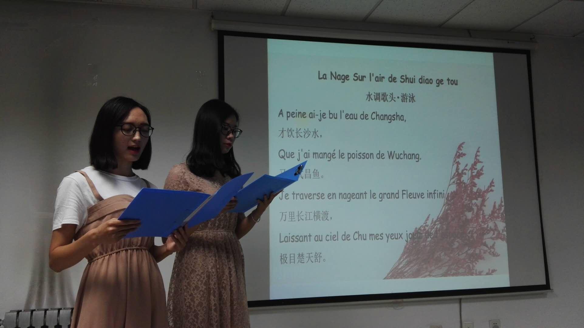 硕2017级党支部书记朱海博激情的介绍中,诵读活动拉开帷幕。党支部书记朱海博首先从学习、继承、批判、革新四个方面介绍了毛泽东诗歌与中国传统文化的关系。积极分子张健和张静慷慨激昂地朗诵了《沁园春· 长沙》。这首诗毛泽东写于1925年,可以感受到他的博大情怀和革命的豪情壮志。党员刘雅恬和积极分子宋爽朗诵了悲壮豪迈的《忆秦娥·娄山关》。这首诗是毛泽东1934年途经娄山时写的,反映了诗人毛泽东虽知长路艰险,但已定下从头做起的决心与勇气。党员马瑞敏和积极分子王闵利朗诵了展现革命气概的《水调歌头·重上井冈山》。这首诗写于1965年,以登井冈山为题材,表达诗人要继续革命的英雄气概。党员苗高扬朗诵了《七律·人民解放军占领南京》。这首诗写于渡江战役时,表现了诗人毛泽东对于革命巨大胜利的激动与喜悦。积极分子展怡和范思颖朗诵了《卜算子·咏梅》。这首诗写于三年自然灾害,毛泽东通过咏梅来表达自己是无私无畏的共产主义战士。党员范蕊与积极分子代晓婷朗诵了酣畅淋漓的《水调歌头·游泳》。这首诗毛泽东写于1956年,正值武汉长江大桥建设时期,反映了长江的宏伟建设和祖国巨大变化。同学们有效地利用了多媒体技术,声情并茂地朗诵使观众产生了强烈的共鸣,赢得了阵阵掌声。在朗诵的过程中,范蕊同学与代晓婷同学用中法双语朗诵了《水调歌头· 游泳》,其他同学均用中英双语朗诵,他们深情的朗诵深深地震撼着每一位观众。