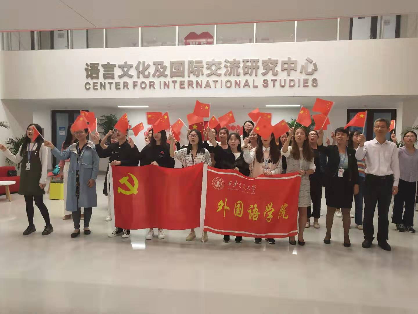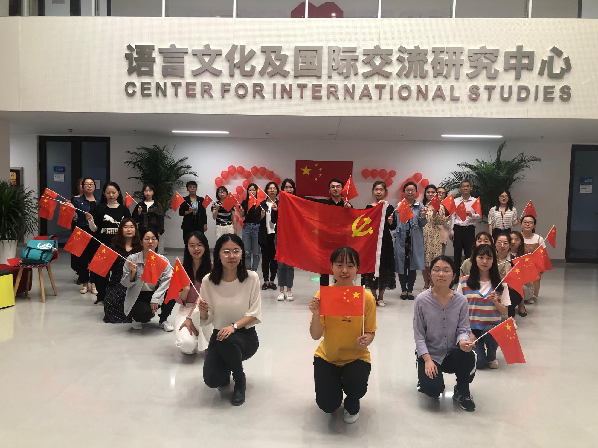 最后,各位老师与同学们在语言文化及国际交流研究中心大厅内一起重温入党誓词,一同歌唱祖国,为党和国家献上最诚挚、最真切的祝福!