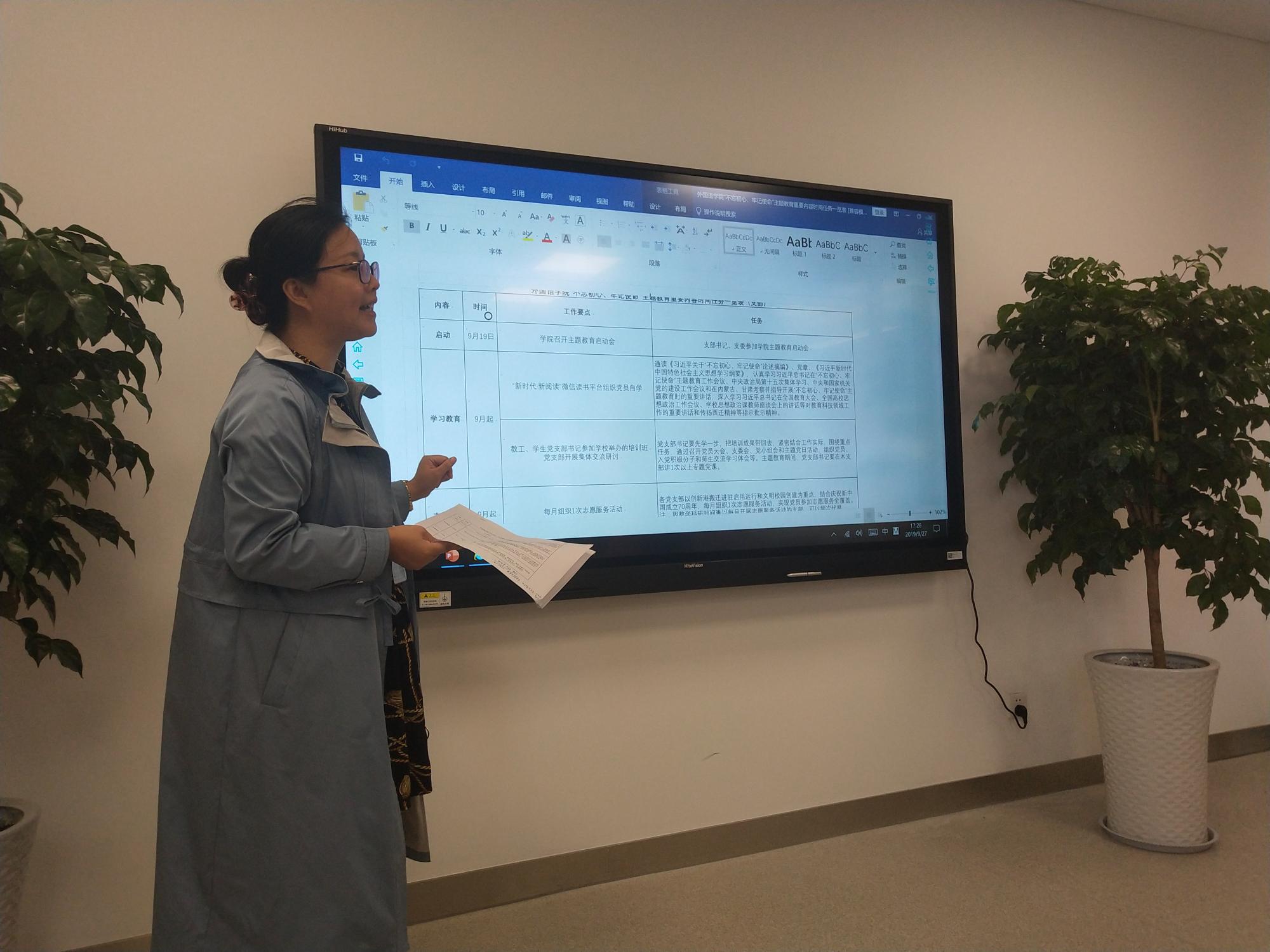 党委副书记许明老师为大家介绍了 “不忘初心、牢记使命”主题教育的重要内容、时间及任务。此次活动将于9月19日正式启动,从学习教育、志愿服务、检视问题与整改落实等方面全面展开,她对污污漫